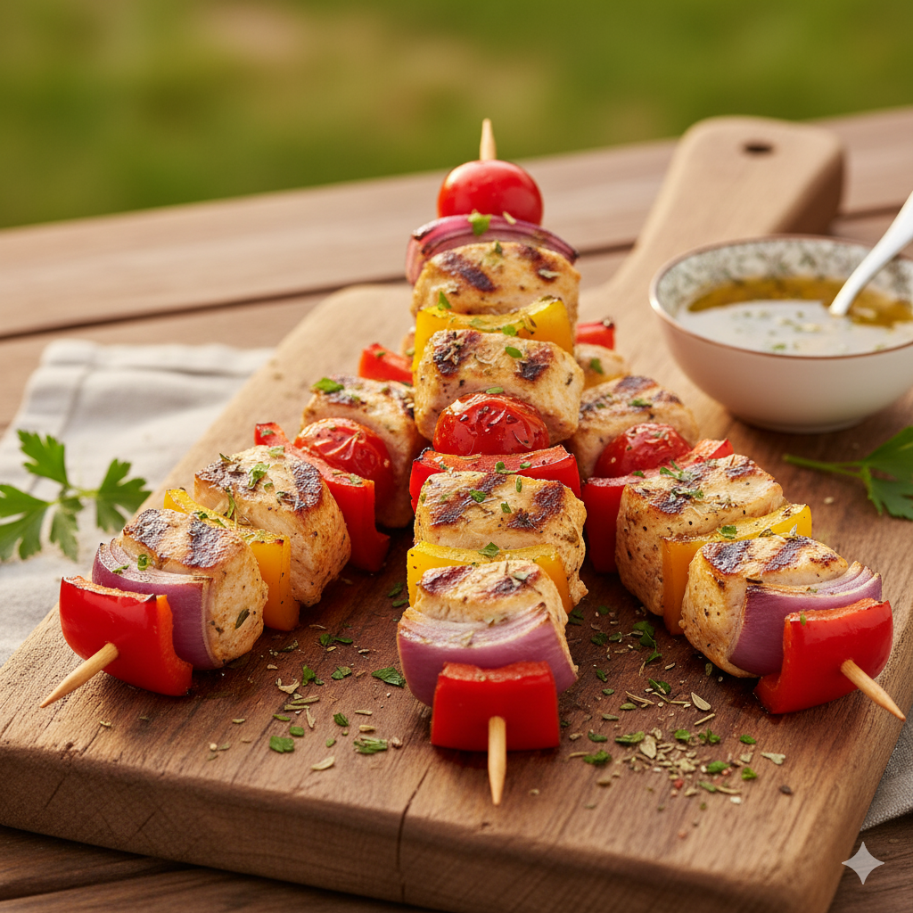 Marinated chicken breast chunks alternating with bell peppers, onions, and cherry tomatoes, grilled to perfection.